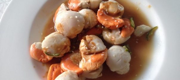 Mettere in un wok già caldo l’olio e il cipollotto affettato molto sottilmente e fare stufare aggiungendo un goccio d’acqua. Scolare le capesante dal loro succo, staccando la noce arancione dal corpo bianco centrale per levare la pellicola dura di collegamento. Inserire nel wok prima la parte arancione, che ha tempi di cottura più lunghi, poi quella bianca, più tenera.