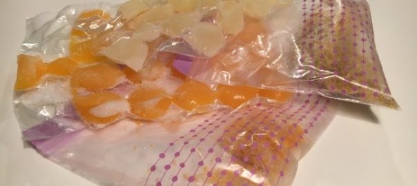 Ma non è finita, dalla frutta, privata della sua buccia, procedo a spremere il succo e con un imbuto verso tutto in quei sacchettini pre formati a cubetto che poi si infilano nel congelatore, così mi preparo in anticipo anche il succo di agrumi già dosato (e lavo lo spremiagrumi solo una volta).