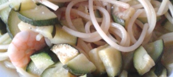 Pulire e tagliare le zucchine in quattro sezioni di rondelle e farle saltare in un tegame a bordi alti con un cipollotto tritato molto finemente e un goccio di olio extra vergine di oliva, aggiungendo appena un goccio di acqua calda di cottura della pasta. Quando gli spaghetti cominceranno a piegarsi, prelevarli con una pinza dalla pentola e versarli nel tegame con le zucchine, facendo cuocere tutto insieme, aggiungendo, di volta in volta e con il mestolo, l’acqua di cottura. Non appena gli spaghetti saranno quasi al dente, aggiungere i gamberetti già scongelati e sgusciati, privati della testa e dell’intestino (ovvero del filamento nero sul dorso dei gamberi, che va sempre eliminato).