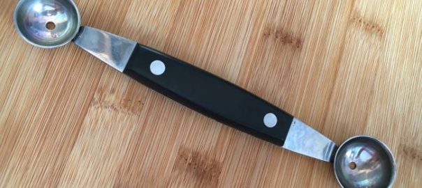 Ecco un uso per lo scavino, si scava una metà della baby anguria epoi la si riempie di sferette.